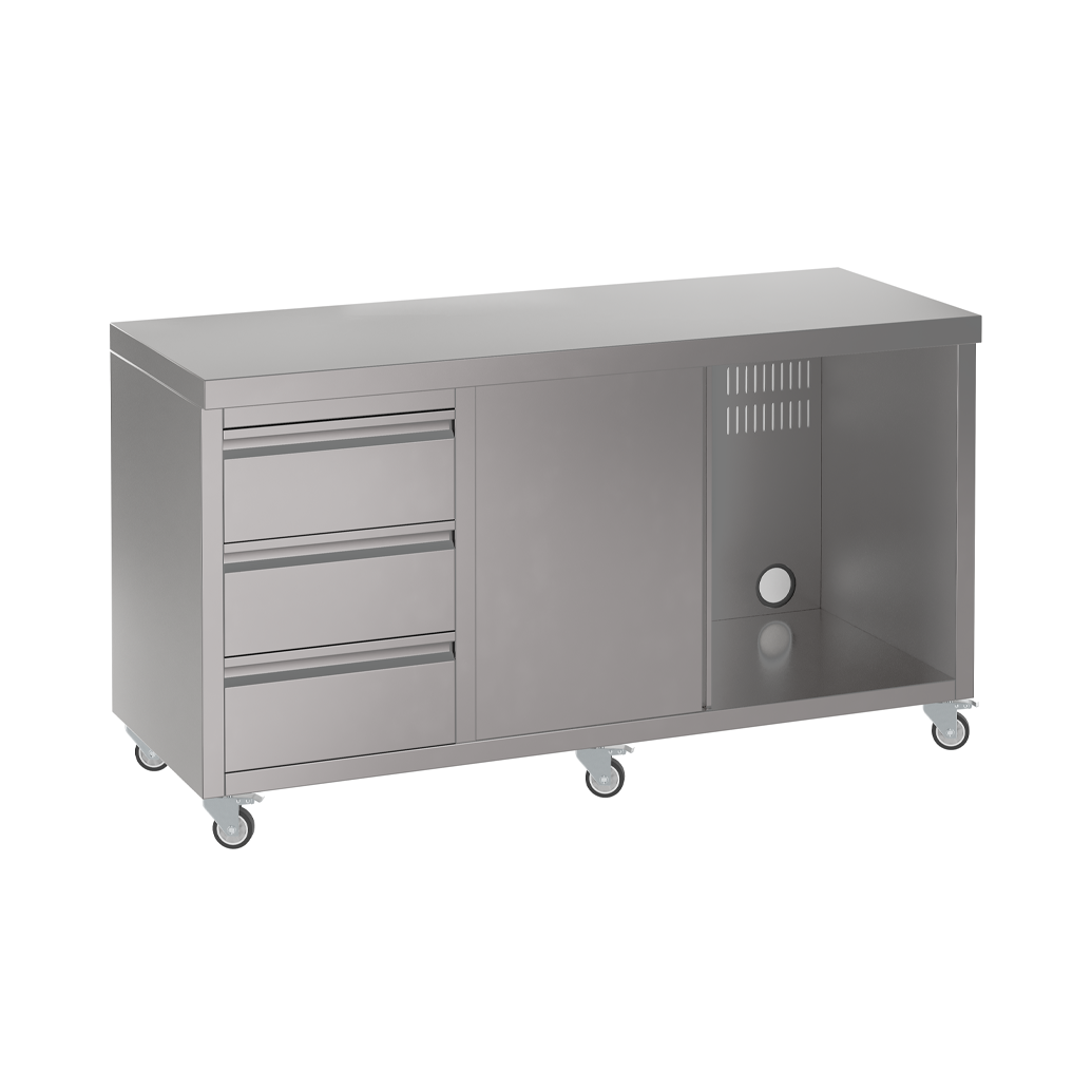 Versatile cabinet with fridge recess, back vent, a hinge door and drawers.