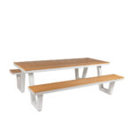 This picnic table is Wave named for the feature legs. Made from all-weather aluminium and polywood. Extremely stable – we have tested!