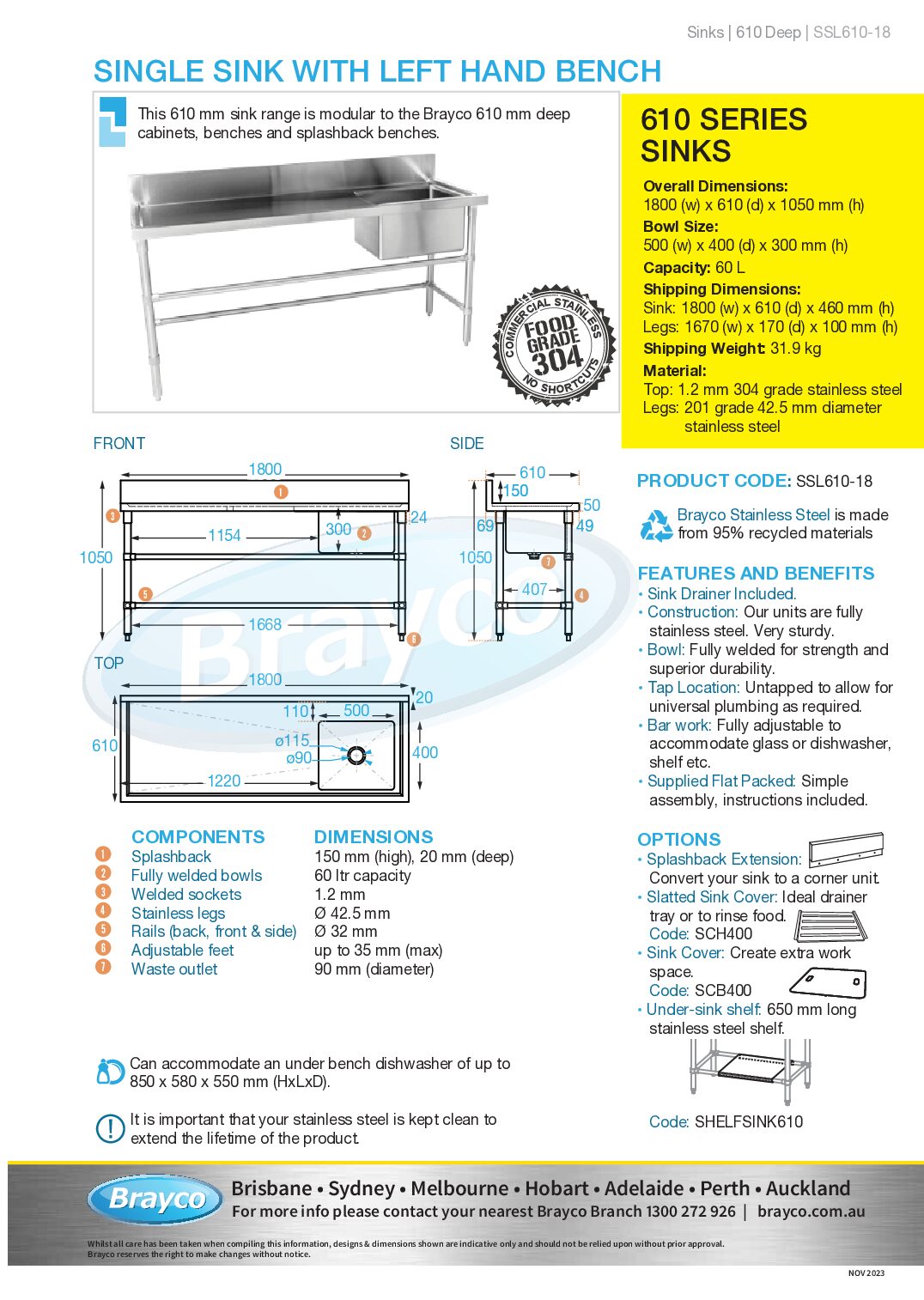 Sink: 1800 x 610 x 460mm high (including splashback)