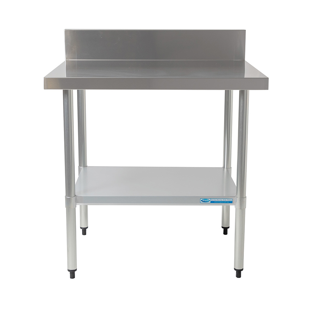 Economy 430 grade stainless bench, with splashback, undershelf and adjustable feet.