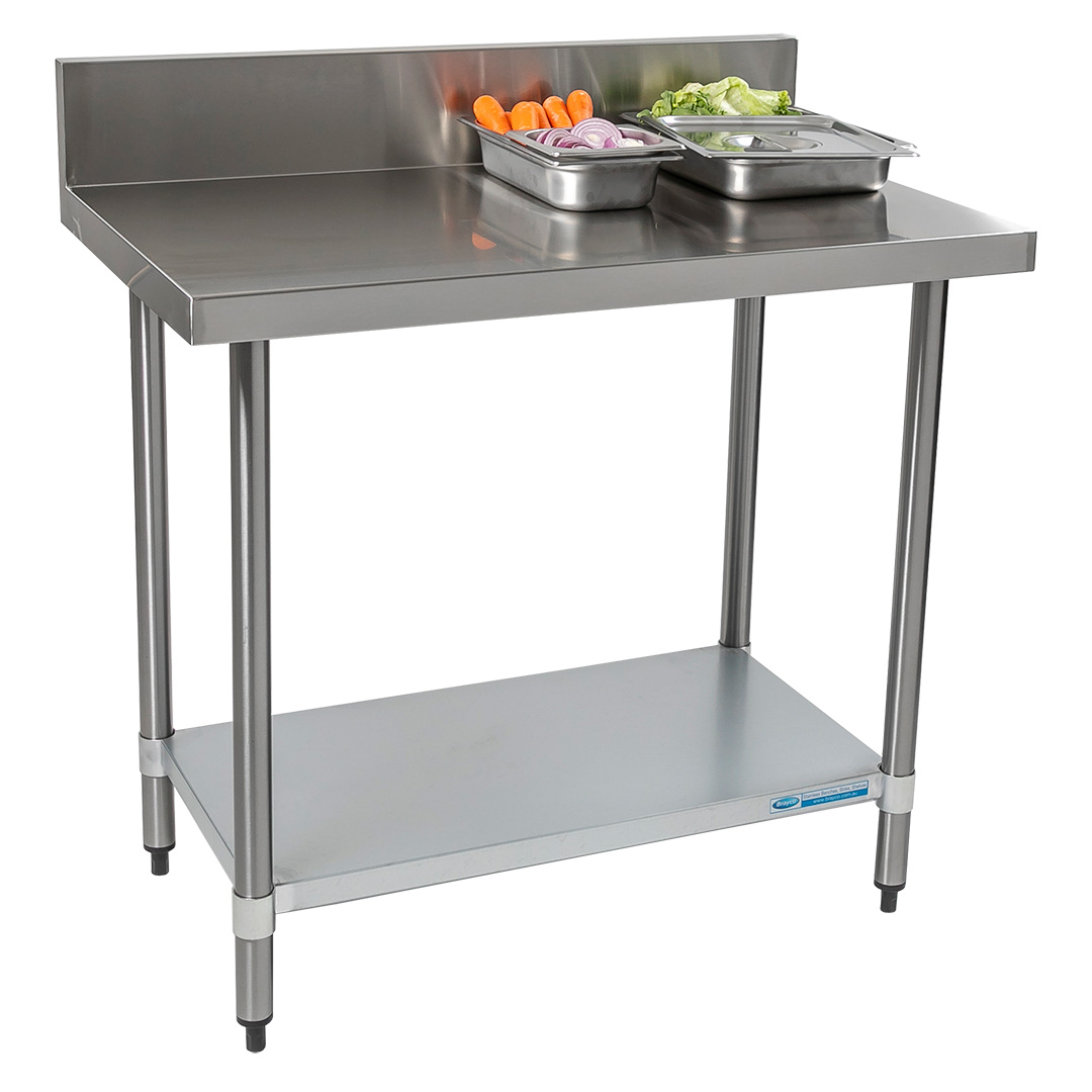 Stainless Steel Splashback Bench, 1000 x 610 x 900mm high. Food grade 304 stainless bench, with splashback, undershelf and adjustable feet.