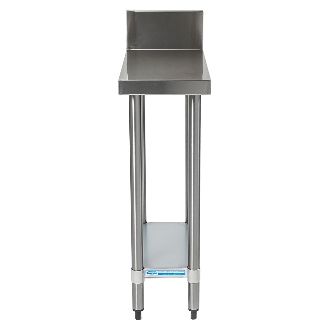 Stainless Steel Splashback Bench, 300 x 610 x 900mm high. Food grade 304 stainless bench, with splashback, undershelf and adjustable feet.