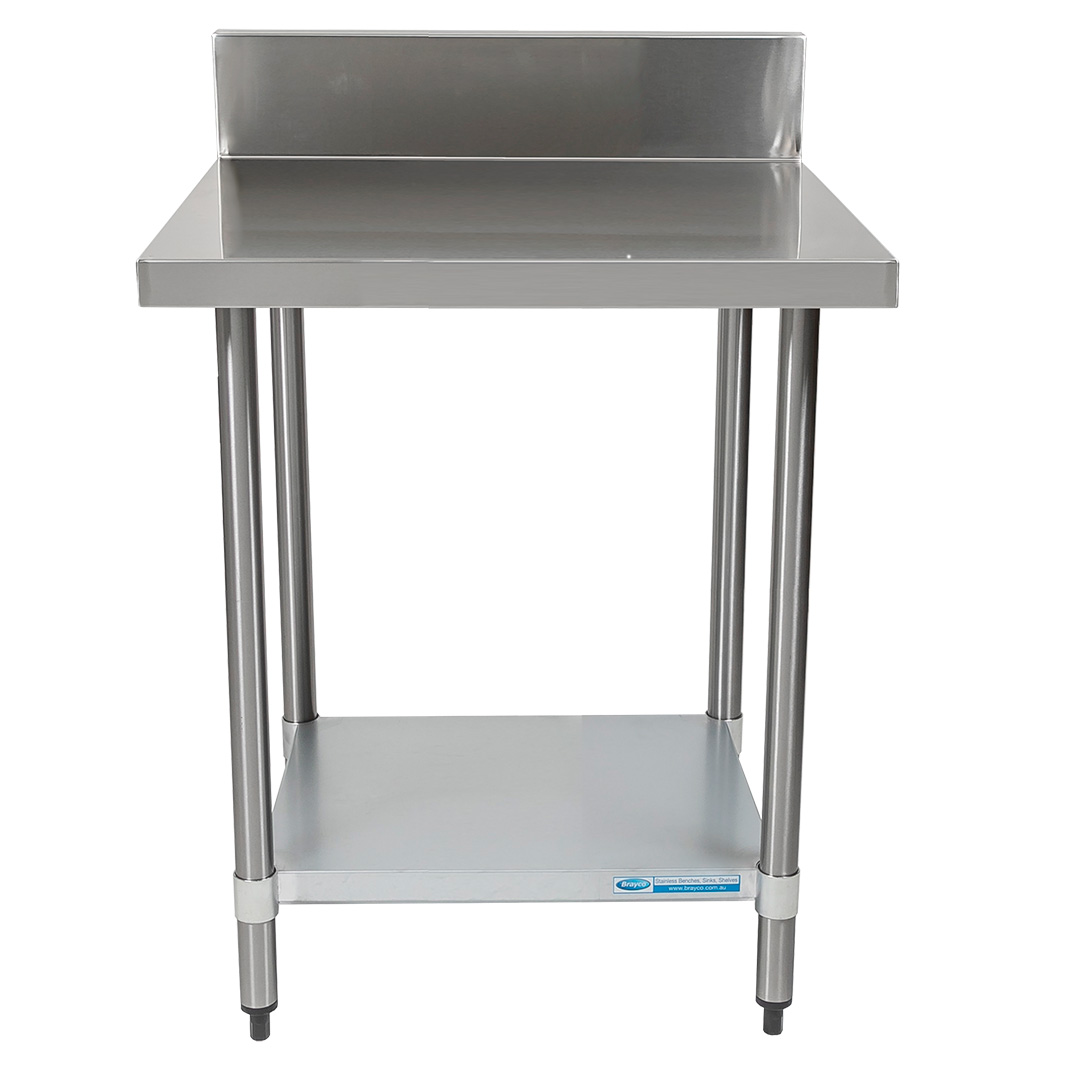 Stainless Steel Splashback Bench, 800 x 610 x 900mm high. Food grade 304 stainless bench, with splashback, undershelf and adjustable feet.